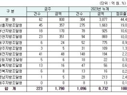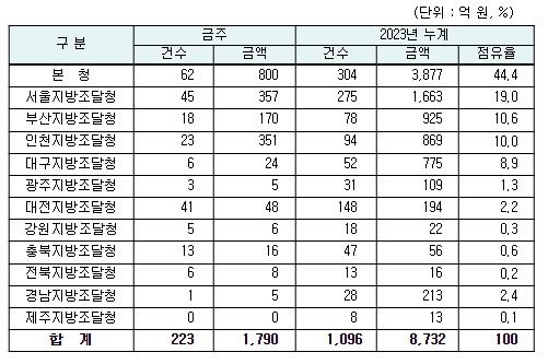 지역별 발주량을 보면 대전광역시 소재 본청 800억 원, 서울지방청 357억 원 등 2개청(1,157억 원)이 전체 금액(1,790억 원)의 64.6%를 차지하고 있으며, 인천 등 나머지 10개 지방청 633억 원이 각각 집행될 예정이다.