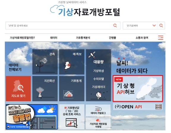 기상청은 국민 누구나 기상기후데이터를 한 곳에서 실시간으로 제공받을 수 있는 '기상청 에이피아이(API)허브'를 2023년 2월 6일(월)부터 ‘기상자료개방포털’누리집을 통해 제공한다고 밝혔다.