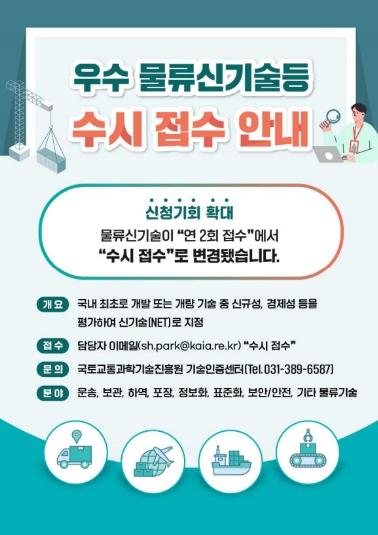 국토교통부는‘우수 물류신기술’을 활성화하기 위해 상·하반기 연 2회 접수 방식에서‘수시 접수’로 변경한다.