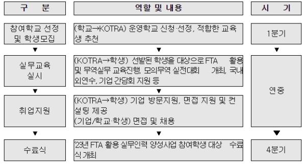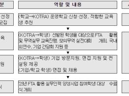 (추진일정) ① 2.8(수) 참가 희망 학교 모집 공고를 시작으로 ② 학교 선정?교육생 선발(3~4월), ③ FTA 실무교육 실시(5~9월), ④ 모의무역실전대회(11월), ⑤ 해외연수(4분기), ⑥ 현장실습 및 정식채용의 순서로 진행될 예정