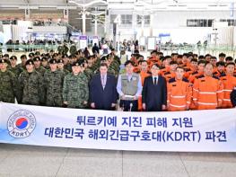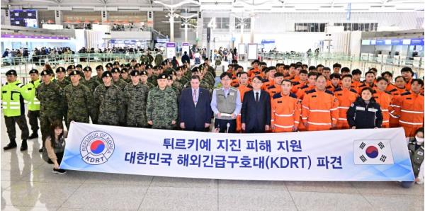 외교부, 국방부, 소방청, KOICA로 구성된 118명 규모의 튀르키예 지진 피해 대응을 위한 대한민국 긴급구호대(KDRT)가 2.7일 밤 출정식을 갖고, 우리 군수송기를 통해 튀르키예로 출국했다.