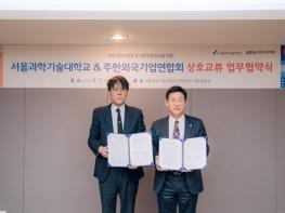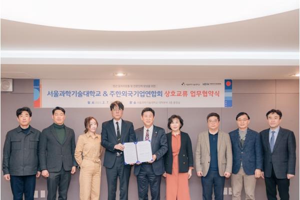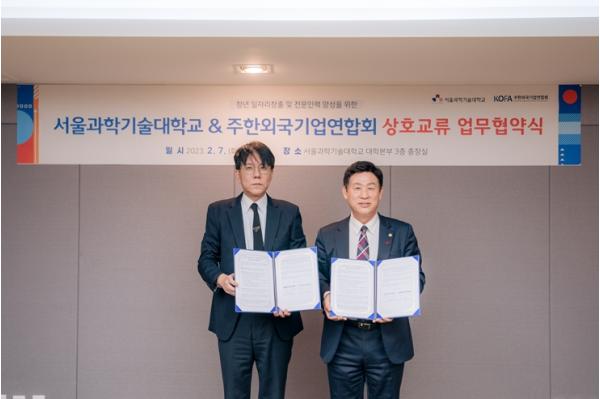 주한외국기업연합회(대표 김종철) 와 서울과학기술대학교(총장 이동훈, 이하 서울과기대)가 2월 7일, 서울 노원구 교내 대학본부 3층 총장실에서 청년 일자리 창출 및 전문인력 양성을 위한 상호 교류 업무협약을 체결했다.
