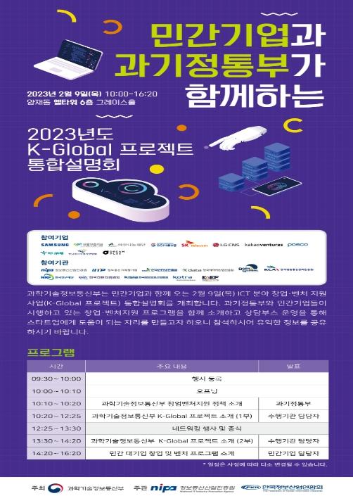과학기술정보통신부는 정보통신기술(ICT) 분야 창업·벤처 지원 사업인'케이-글로벌(K-GLOBAL) 프로젝트'의 2023년 대상 사업을 통합 안내하고, 민간 주도의 창업·성장 지원 프로그램을 함께 소개하는 민·관 통합설명회를 엘타워(서울 양재)에서 2월 9일 개최했다.