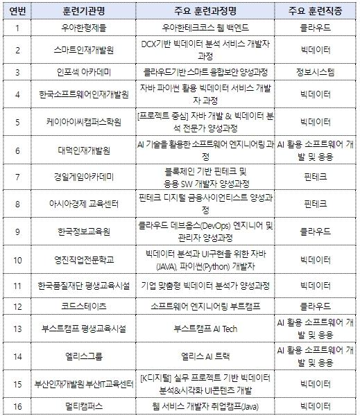 평가 대상 기관 72개소 중 특히 우수한 성과를 거둔 16개 K-디지털 트레이닝 훈련기관을 우수성과기관으로 최종 선정했다.