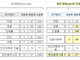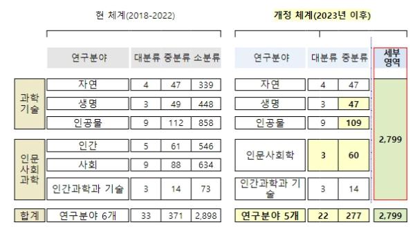 개정 분류체계는 2018년도에 마련된 기존의 분류체계에 대해 학계 등 관련기관들로부터 개정소요와 신기술 경향 등을 반영하여 5개 연구분야, 22개 대분류, 277개 중분류, 2,799개의 세부영역으로 새로이 구성했으며, 향후 5년간 우리나라 과학기술 관련 다양한 영역에서 분류 표준으로 활용된다.