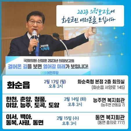 한편, 화순 지역 의정보고회는 13일 화순축협(화순읍)을 시작으로 14일 능주면 복지회관(한천, 춘양, 청풍, 이양, 능주, 도곡, 도암)을 거쳐 15일 동면 복지회관(이서, 백아, 동복, 사평, 동면)에서 3일간 이어질 예정이다.