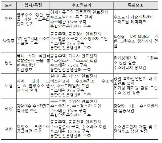 올해부터는 6개(평택, 남양주, 당진, 보령, 광양, 포항)의 지자체에서 신규 수소도시 사업을 착수하며, 내년부터는 본격적인 조성을 시작할 계획이다.