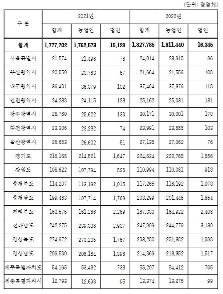 농업경영체는 2022년 말 기준으로 182만 7천 경영체(농업인 1,811, 농업법인 16)가 등록되어 있다. 등록정보는 경영체의 일반현황, 농지 및 농작물 재배 등 농업경영정보 54개 항목(법인 64개)에 대하여 통합경영체관리 시스템으로 관리하고 있다. 지난해에는 47만 3천 호(80만 2천 건)의 정보에 대해 검증을 완료했다.