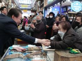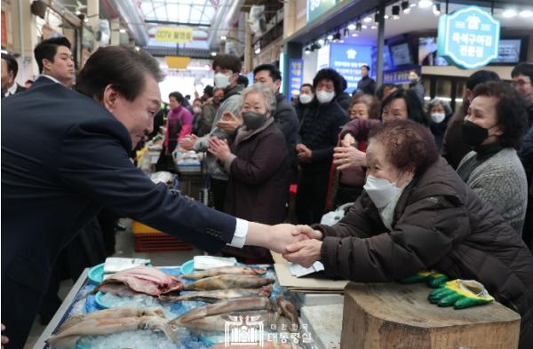 윤석열 대통령은 2월 14일 오후, 충북의 대표 전통시장인 청주 육거리종합시장을 찾아 최근 물가·연료비 상승, 경기둔화 등으로 어려움을 겪고 있는 현장 상인들을 응원하고 격려하는 자리를 가졌다.