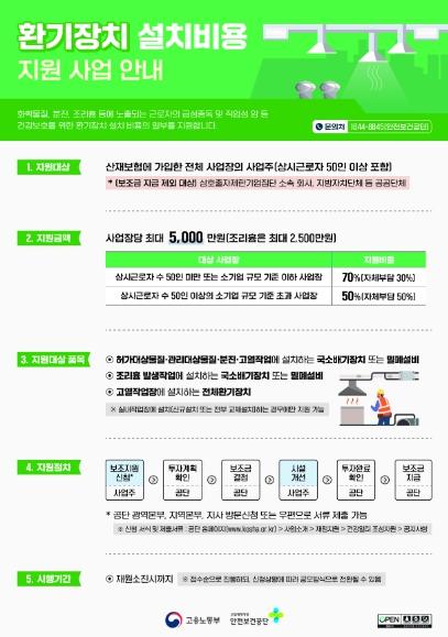 고용노동부는 이와 같은 중소기업의 열악한 경영환경을 고려하고 보다 적극적으로 근로자들의 급성중독 예방하기 위하여 환기장치 설치비용 지원사업을 신규로 마련했다. 이번 지원 대상에는 급성중독 예방을 위한 화학물질 취급사업장 환기장치뿐만 아니라 조리실 폐암 예방을 위한 조리시설용 환기장치도 포함된다.