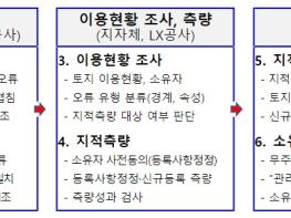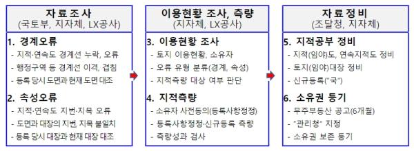 먼저, 전국 4천만 필지 전부를 대상으로 최초 등록된 대장 및 도면, 측량자료, 항공사진을 활용한 정밀조사를 실시하여 경계나 면적 등에 오류가 있는 6만 5천 필지를 발굴했으며, 이를 대상으로 토지이용현황 조사 및 지적측량을 실시했다.