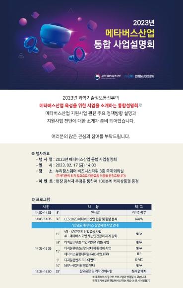 올해는, 정부 지원사업 홍보를 위해 그간 코로나19 등으로 인해 온라인으로 진행해왔던 통합설명회를 2월 17일 오후 2시, 서울 상암동 누리꿈스퀘어(3층, 국제회의실)에서 관련 기업과 대면하면서 세부사업별로 구체적으로 설명하고 기업의 목소리를 좀 더 가까이서 청취할 계획이다. 아울러 국제전자제품박람회(CES) 2023에서 주목받은 확장가상세계(메타버스) 산업 현황 및 동향 분석도 함께 이루어질 예정이다.
