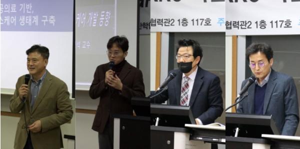 인공지능헬스케어센터 문봉근 실장 사회로 시작한 설명회 1부에서 가천대 김영주 교수는 ‘지자체 공공의료 기반 디지털 헬스케어 생태계 구축’에 대한 발표를 했으며, 가천대 김정석 교수는 ‘전자약 응용기술 및 차세대 헬스케어 개발 동향’에 대한 내용을 발표했다.