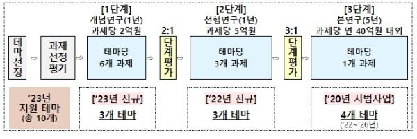 또한, 작년 개념연구(1단계)를 마친 3개 테마, 9개 과제는 본연구에 앞서 연구방향을 심화하는 선행연구(2단계)를 지원하고, 올해 말 평가를 통해 대규모(연 40억원 내외, 5년) 지원 과제(본연구, 테마당 1개)를 선정할 계획이다.