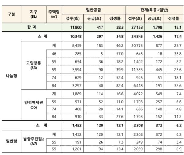 특별공급과 일반공급을 합한 최종 평균 경쟁률은 15.1대 1로 1,798호 공급에27,153명이 접수한 것으로 나타났으며, 최종 유형별 경쟁률은 나눔형 17.4대 1, 일반형 6.2대 1을 기록하였고, 지역별로는 고양창릉이 23.7대 1, 양정역세권 7.4대 1, 남양주진접2 6.2대 1을 기록하였다.