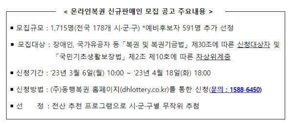 기획재정부 복권위원회(위원장: 최상대 제2차관)는 2023년 2월 20일자로 복권 수탁사업자인 ㈜동행복권을 통해 장애인·국가유공자 등 우선계약대상자를 대상으로 하는 온라인복권(로또 6/45) 신규판매인 모집(1,715명) 공고를 했다.