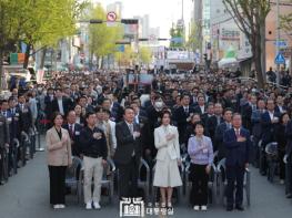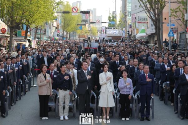 윤석열 대통령 부부는 4. 1일 오후 대구 서문시장에서 개최된 ‘서문시장 100주년 맞이 기념식’에 참석했다. 윤 대통령은 기념식 축사에서 대선 후보 당시 서문시장 유세를 떠올리며 ‘국정의 방향과 목표가 오직 국민’이라는 초심을 다시 새기게 된다고 말했다.