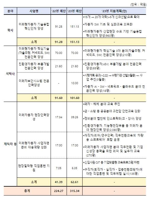 정부는 소프트웨어 등 미래차를 선도할 핵심인력 양성을 위해 2023년 315억 원을 투입하여 미래차 분야 총 3,735명을 양성할 계획으로, 자동차 부품기업이 다수 분포된 지역을 찾아가 사업 설명회를 개최하여 정책 수혜자인 기업 및 대학교에 올해 신설 및 변경되는 미래차 인력양성사업을 상세히 안내한다.