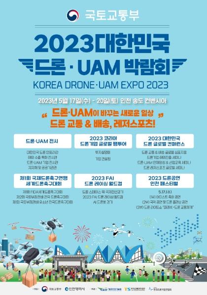 국토교통부와 인천광역시는 제4회'2023 대한민국 드론 ? UAM 박람회'를 5월 17일부터 20일까지 4일간 인천 송도 컨벤시아에서 공동 개최한다고 밝혔다.
