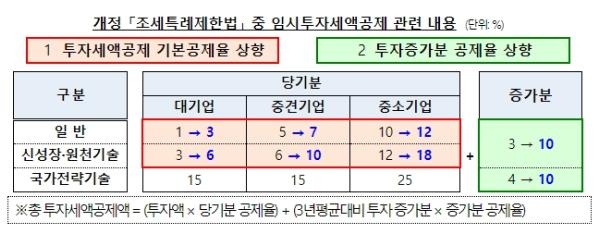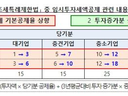 임시투자세액공제는 두 부분으로 구성되는데, 기업은 먼저 1기본공제율 상향(하단 표 )으로 올해 투자금액 중 2~6%p 늘어난 세액공제 혜택을 받게 되고, 2투자증가분 공제율 상향(하단 표 )으로 직전 3년 평균에 비해 늘어난 투자금액 중 10%를 추가로 공제(종전 3~4% 대비 6~7%p 증가)받게 된다.