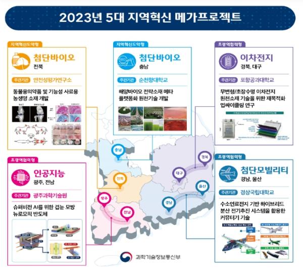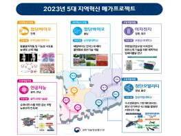 과학기술정보통신부는 지역의 중장기 혁신에 필요한 원천기술 개발 및 지역산업?경제로의 확산을 촉진하는 ‘지역혁신 메가프로젝트 사업’에 경북?대구(이차전지), 경남?울산(첨단모빌리티), 광주?전남(인공지능), 충남, 전북(첨단바이오)에서 수행하는 5개 프로젝트를 신규 선정했다고 밝혔다.