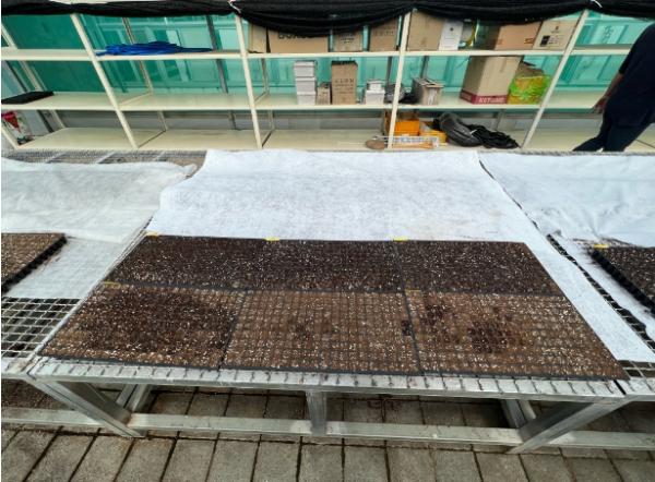 참깨 모를 기르는 상자에 흙을 채우고 씨를 뿌린 뒤 상자 아래쪽까지 물이 스며들도록 충분히 물을 준다. 그 뒤 130g/㎡ 이상 두께의 부직포를 덮고 바람에 날리지 않도록 고정해 부직포 내부 온도가 유지될 수 있도록 한다.