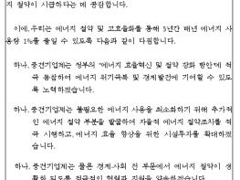 중견기업계는 “중견기업계 에너지절약 실천 선언”을 통해 향후 5년간‘매년 에너지 사용량 1% 감축’목표를 제시하고, 기업의 에너지 효율혁신을 위한 시설투자 확대 및 정부 에너지 절약정책 적극 동참 등 자율적 에너지 절감을 위해 적극 노력하기로 다짐했다.