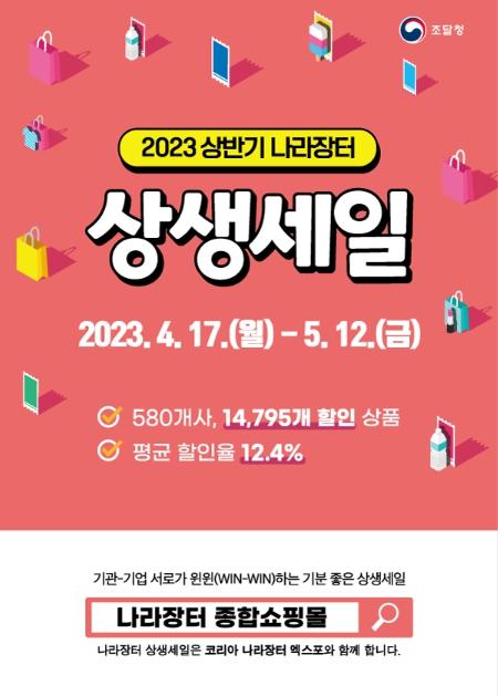 조달청은 조달기업의 판로를 지원하고, 수요기관에게 예산절감의 기회를 제공하기 위한 ‘2023년 상반기 나라장터 상생세일’을 오는 4월 17일부터 5월 12일까지 한 달간 개최한다.