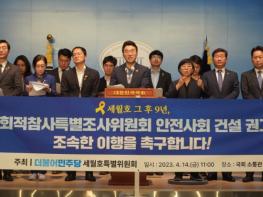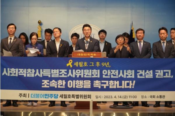 더불어민주당 세월호특별위원회(위원장 박주민)이 주최하고 김남국 국회의원(안산시 단원구을)이 주관하는 “세월호 그 후 9년, 사회적참사특별조사위원회 안전사회 건설 권고, 조속한 이행을 촉구합니다!” 기자회견이 14일 오전 11시 국회 소통관에서 열렸다.