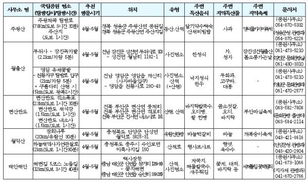 이번 국립공원 5곳에 대한 상세한 정보 및 문의처는 국립공원공단 누리집 공지사항에서 4월 17일부터 확인할 수 있다.