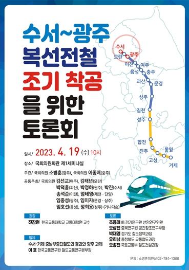 오는 4월 19일 열리는 '수서~광주 복선전철 조기 착공을 위한 정책토론회'에서는 정·관·학이 한자리에 모여 수서~광주 복선전철 건설 사업의 신속한 착공 방안을 함께 모색할 예정이다. 이 토론회에서는 대한민국 철도산업에서 가지는 중요성을 확인하고 신속한 착공 및 더 이상의 공사 지연을 방지할 방법을 모색함으로써 일관된 수송 및 교통 체계를 구축하고 내륙간선철도망의 효율성을 제고할 예정이다.