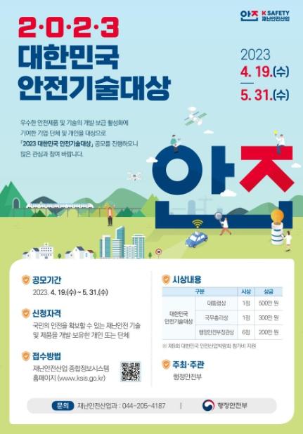 행정안전부는 2023년 4월 19일부터 5월 31일까지 ‘2023 대한민국 안전기술대상’ 후보를 공개모집 한다고 밝혔다.