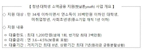 특히, 최 차관은 복권기금으로 지원되는 '햇살론유스' 사업의 보증재원이 4월중 소진될 우려가 있음을 보고 받고, 청년?대학생들이 소액 금융대출에 어려움을 겪지 않도록 '햇살론유스' 사업출연금을 증액하여 대출공급규모를 1천억원 확대하는 방안을 금융위 등과 추진하기로 했다.