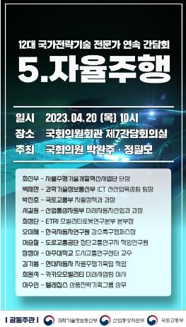 국회 과학기술정보통신위원회 소속 박완주 의원과 정필모 의원이 공동주최하고, 정부 부처(과학기술정보통신부?국토교통부?산업통상자원부)가 공동주관하는 『12대 국가전략기술 첨단모빌리티- 자율주행 전문가 연속 간담회』가 20일 개최된다.
