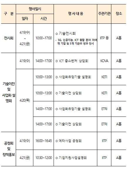 과학기술정보통신부는 4월 19일부터 4월 21일까지 3일간 서울 삼성동 코엑스에서 ‘정보통신(‘ICT’) 기술사업화 페스티벌’과 ‘대학 정보통신 연구센터(ICT R&D Center, ‘ITRC’) 인재양성 대전’을 개최한다.