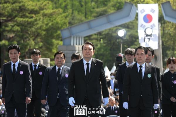 윤석열 대통령은 4. 19일 오전 국립4·19민주묘지에서 개최된 제63회 4·19혁명기념식에 참석해, 4·19혁명 열사의 뒤를 따라 어떠한 희생을 치르더라도 자유민주주의를 확고히 지켜내겠다고 밝혔다.