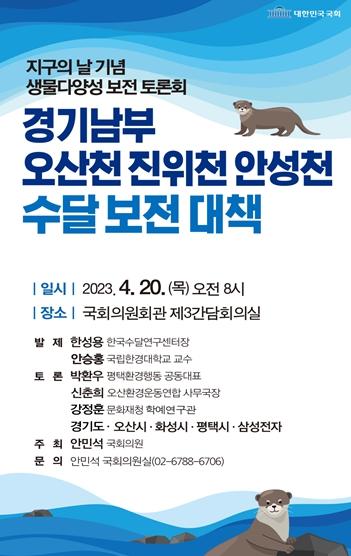 20일 오전 8시 국회 의원회관 3세미나실에서 안민석 의원의 주최로 이색 토론회가 열렸다. 지구의 날 기념 '경기 남부 오산천, 진위천, 안성천 수달보전 대책' 국회 토론회에서는 안민석 의원의 인사말씀과 홍기원 의원의 축사가 진행됐다. 좌장은 김진세 오산환경운동연합 공동의장이 맡았고, 발제는 한성용 한국수달연구센터장과 안승홍 한경국립대학교 교수가 맡았다. 토론자로는 박환우 평택환경행동 공동대표, 신춘희 오산환경운동연합 사무국장, 강정훈 문화재청 학예연구관, 정택준 경기도 자연생태팀장, 최병주 화성시 공원조성과장, 김진성 평택시 환경국장, 삼성전자 황호송 상무가 나섰다.