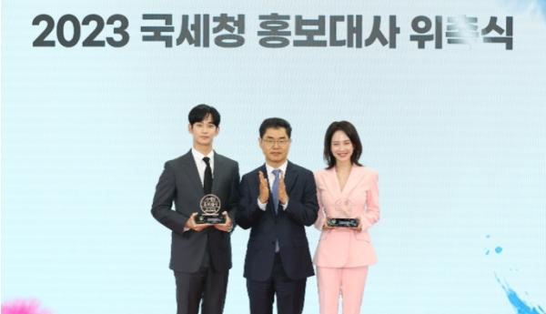 국세청은 제57회 납세자의 날(’23.3.3.)에 모범납세자로 대통령 표창을 수상한 연예인 김수현?송지효(본명 천수연)를 4월 21일 국세청 홍보대사로 위촉했다.